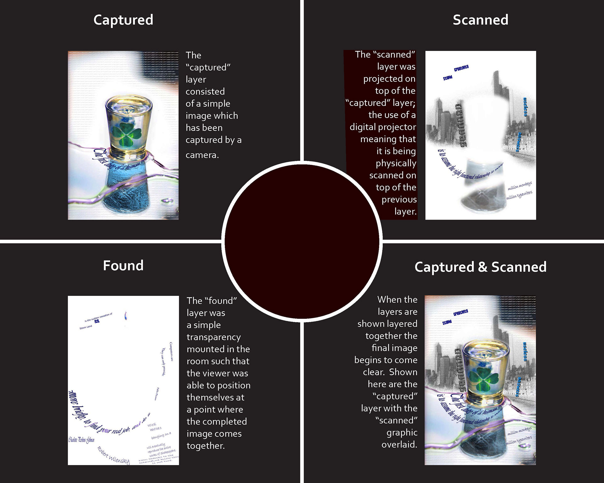 The goal of this project was to create an art project based around objects that were "found, captured, and scanned." My project consisted of actively pursuing all three while experiencing a multi-layered final product.